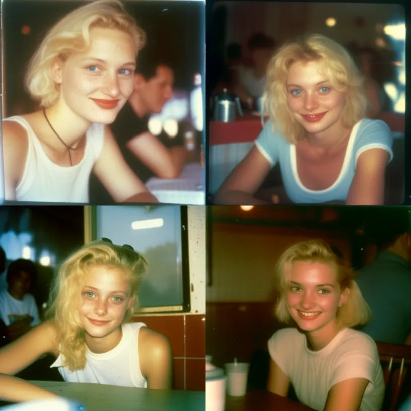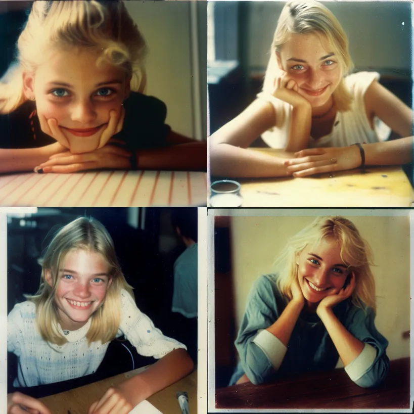 blonde girl leaning on table and smiling at camera, detailed facial features, detailed eyes, polaroid, 1990 | blonde girl leaning on table and smiling at camera, detailed facial features, detailed eyes, polaroid, 1990 --no hands |