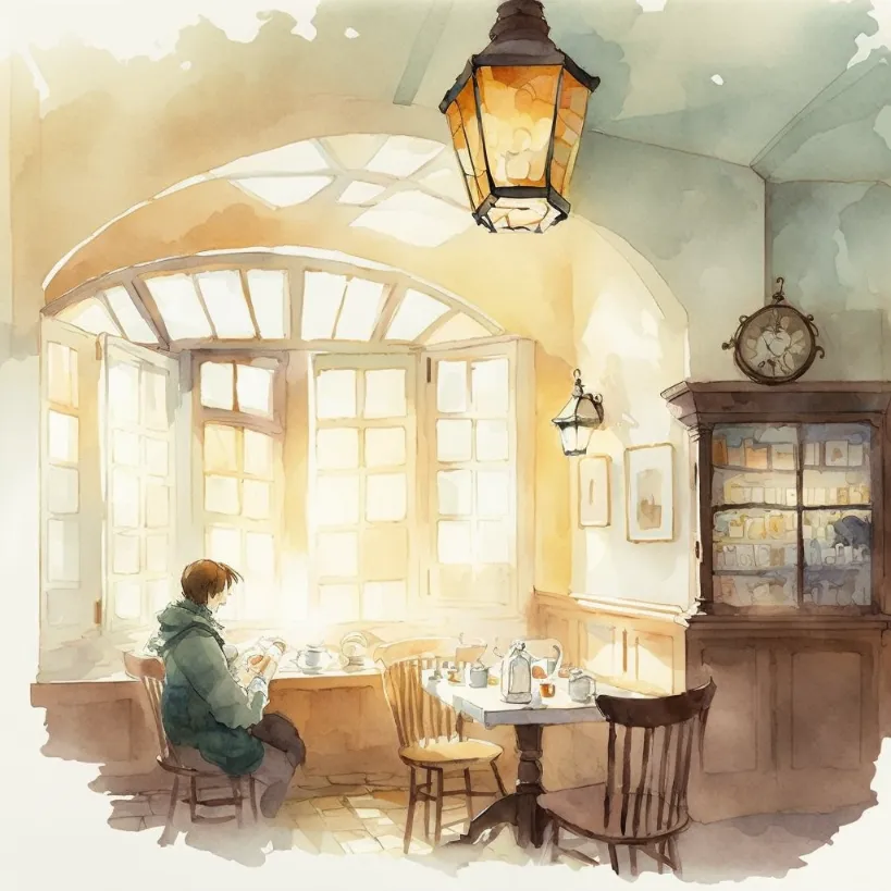 light watercolor, interior of a cozy cafe, bright, white background, few details, dreamy, Studio Ghibli --seed 3817455947 | light watercolor, interior of a cozy cafe, bright, white background, few details, dreamy, Studio Ghibli --seed 3817455947 --no people person |