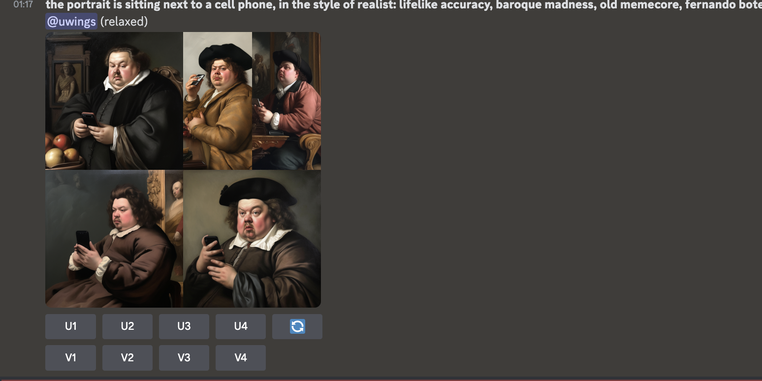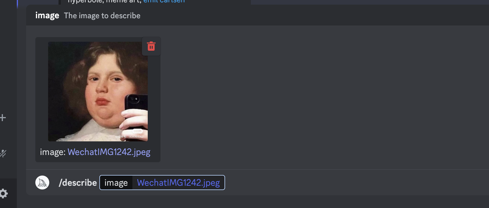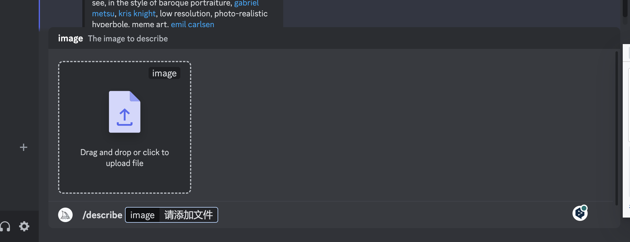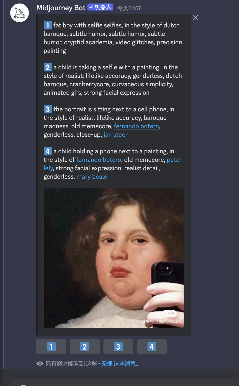 3 圖生文 /Describe 方法簡述1.輸入命令:/describe2.上傳圖片(拖拽或點(diǎn)擊上傳)回車3.得到四套關(guān)鍵詞3.點(diǎn)擊數(shù)字按鈕,自動(dòng)以該關(guān)鍵詞生成圖片是不是有內(nèi)味兒!