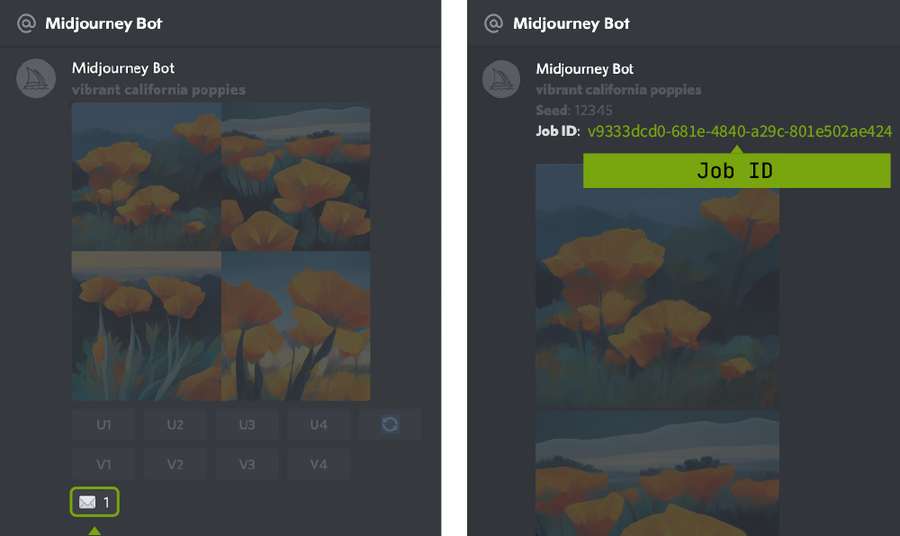 你可以使用圖片唯一的Job ID 與 /show 命令,將一個圖片移動到其他服務器或頻道中,復活失蹤的圖片,或刷新舊圖片以產生新的變化(V),放大(U),或使用新的參數和功能。