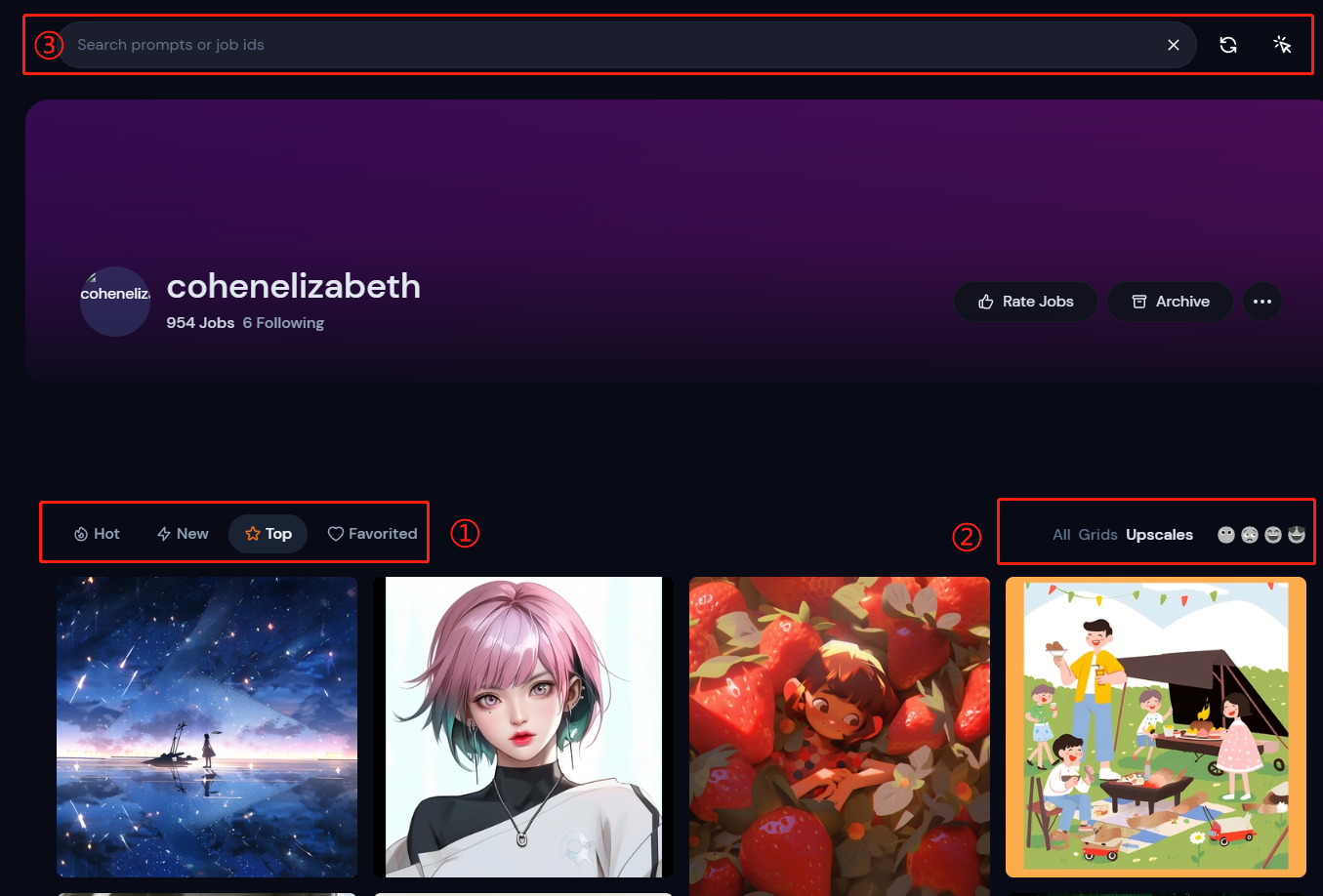 在作品頂部有可切換分欄,更好地檢索往期的作品,其中【Hot】【New】【Top】【Favorited】可用于快速搜索相應的產出類型。